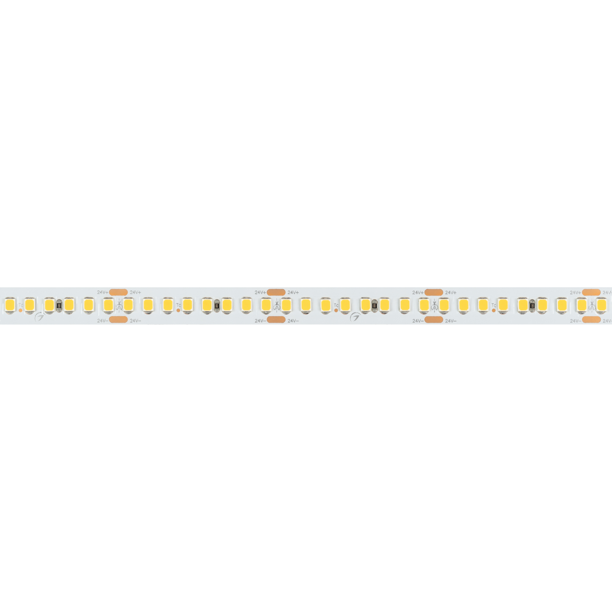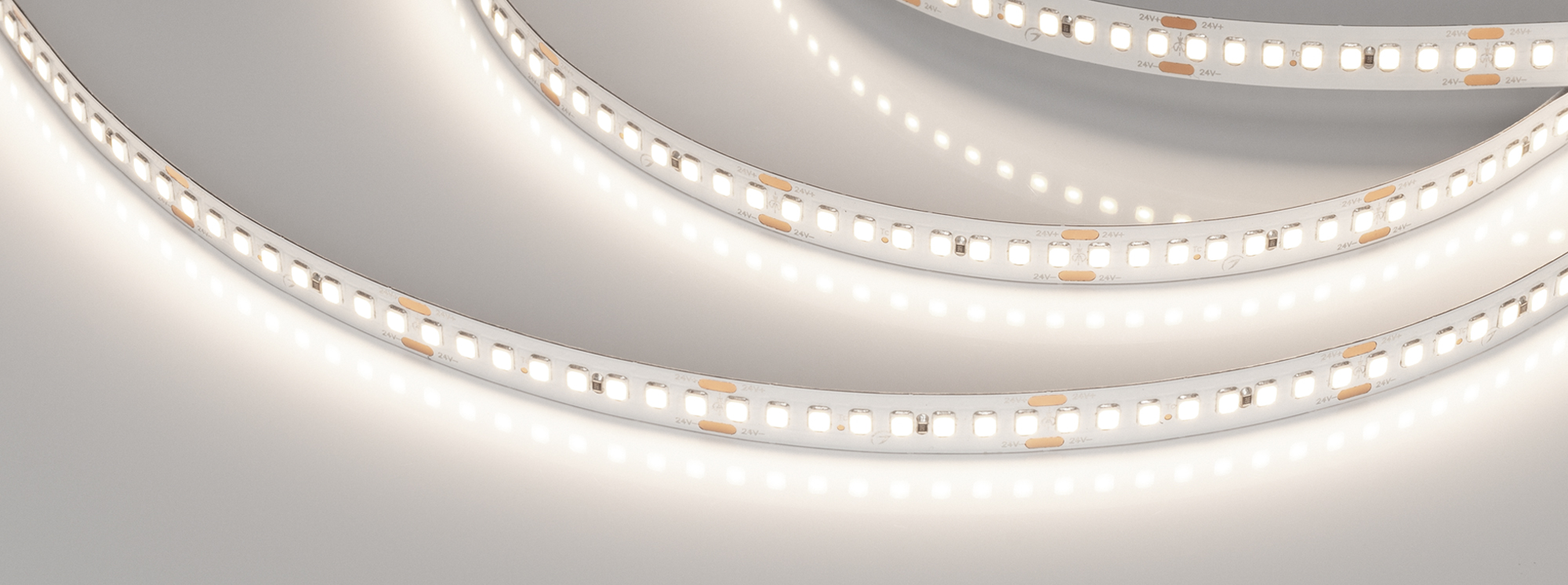 Светодиодная высокоэффективная лента RT серии A192. Светодиоды SMD 2835, 192 шт/м, белая плата шириной 10 мм, скотч 3M. Цвет ДНЕВНОЙ 4000K, высокая световая эффективность 150 лм/Вт, индекс цветопередачи CRI>85, угол 120°. Питание 24 В, мощность 17.6 Вт/м (88 Вт на 5 м). Размеры 5000x10x1.6 мм. Мин. отрезок 41.67 мм, 8 светодиодов. Цена за 1 м. Обязательна установка на профиль.