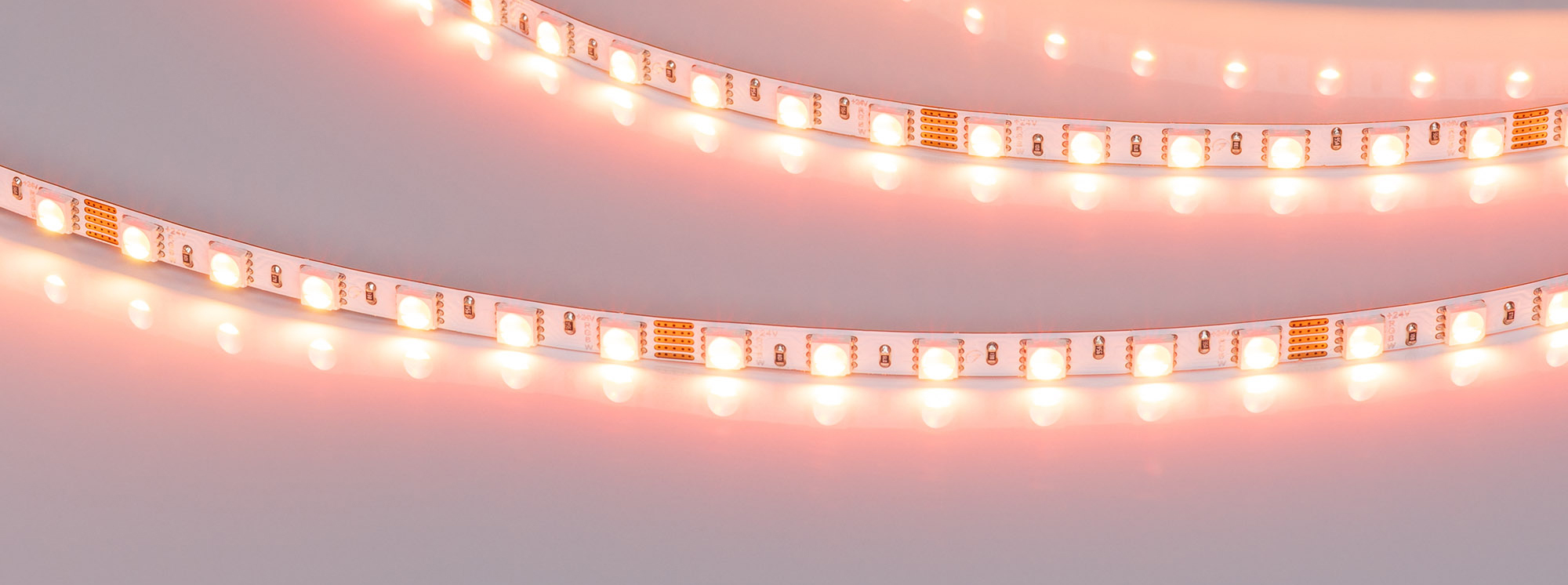 Светодиодная узкая лента RT серии H96. Светодиоды SMD 4040, 96 шт/м, белая плата, ширина 5 мм, скотч 3M. Цвет RGB + ТЕПЛЫЙ 3000K, индекс цветопередачи CRI>90, угол 120°. Питание 24 В, мощность 10 Вт/м (50 Вт на 5 м). Размеры 5000x5x2 мм, мин. отрезок 62.5 мм, 6 светодиодов. Цена за 1 м. Обязательна установка на профиль.