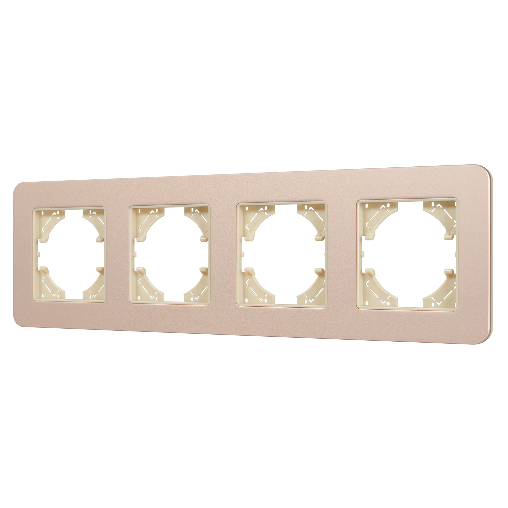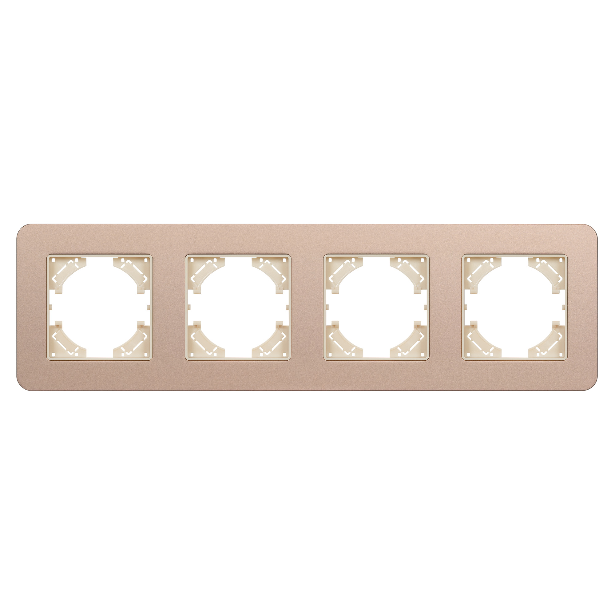 Рамка алюминиевая на 4 поста, под встраиваемый механизм. Цвет - золотой с Soft-Touch покрытием. Среднего уровня герметичности IP20. Ориентация монтажа - горизонтальная (основным ориентиром служат посадочные выступы для накладки механизма).