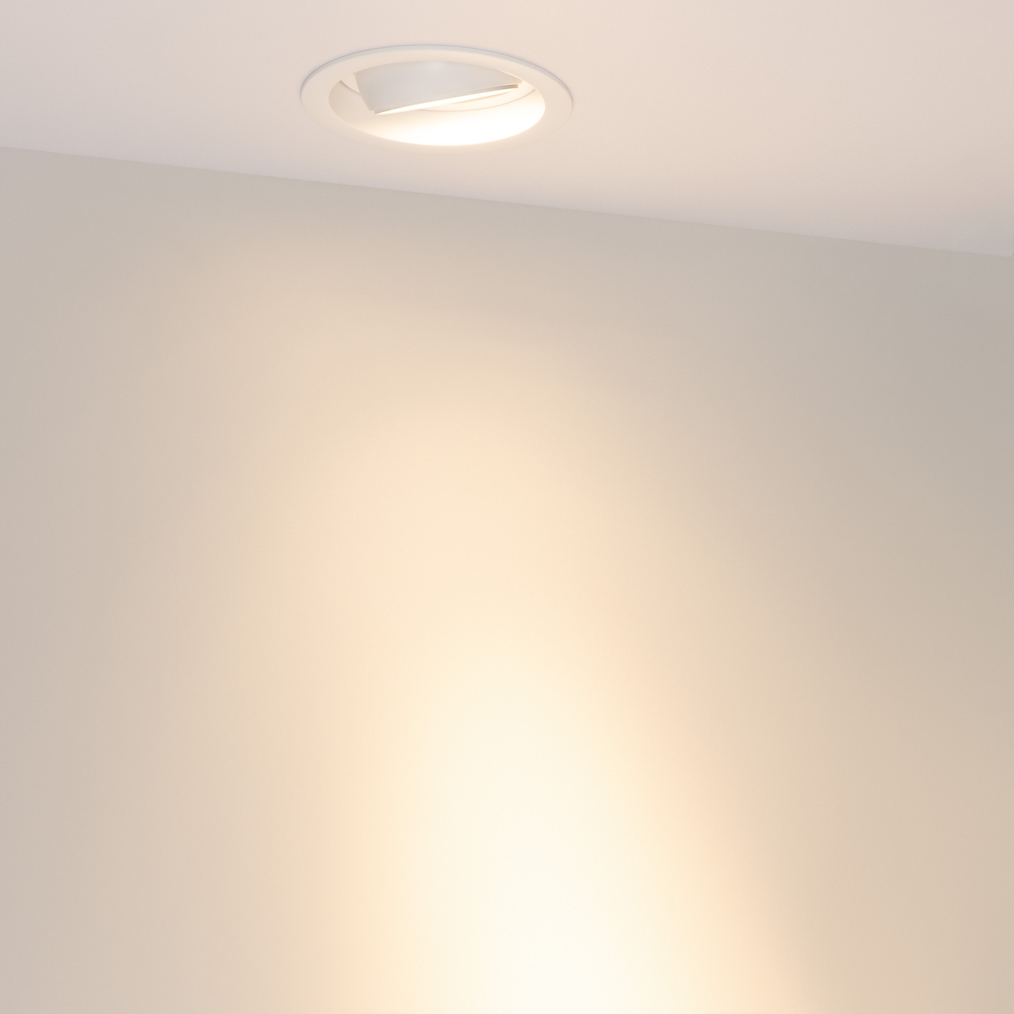Встраиваемый карданный поворотный светильник с высоким индексом цветопередачи CRI>92 предназначен для создания качественного освещения. За основу поворотного механизма светильника взят принцип кардана – подвижное соединение двух колец, вложенных одно в другое. Световой модуль вращается вокруг своей оси на 360 градусов и отклоняется от горизонта на 30 градусов, что позволяет с лёгкостью регулировать направление пучка света и его концентрацию на определенной зоне. Особая конфигурация корпуса из алюминия оригинально смотрится в интерьере и позволяет эффективно отводить тепло. Светильник с углом рассеивания 20 градусов отлично подходит как для локальной акцентной подсветки витрин, прилавков магазинов, бутиков и стендов выставочных залов, так и для общего освещения. Легко устанавливается с помощью пружин в монтажное отверстие потолка. В комплекте поставляется драйвер, что позволяет безопасно и быстро подключать светильник напрямую к сети переменного тока 230 В.