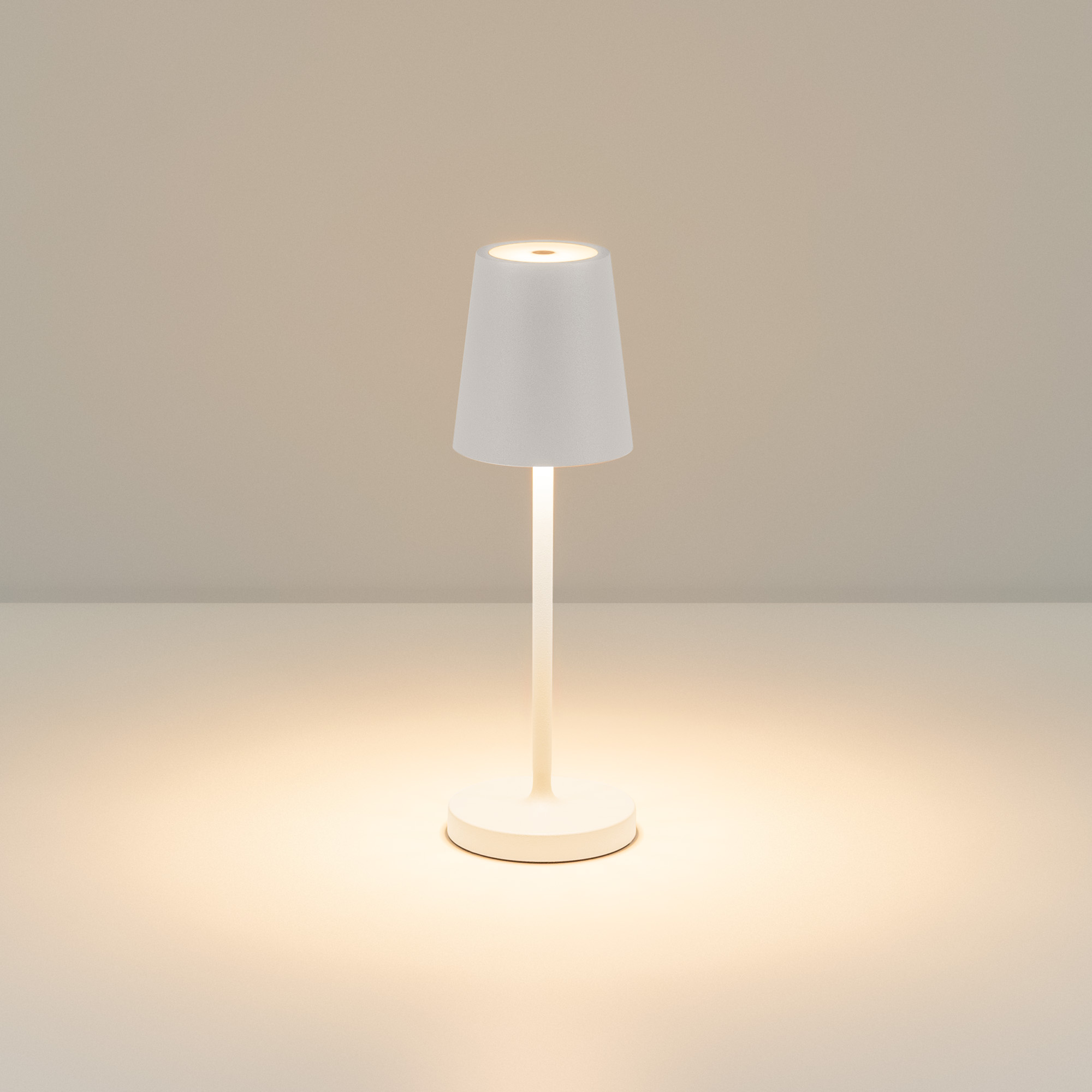 Настольный светильник со встроенным аккумулятором 1.5Вт, алюминиевый корпус, цвет белый. Цвет ТЕПЛЫЙ БЕЛЫЙ 2200-2700-3000K, св.поток 110-130 лм, CRI(Ra)>80, угол 90°. Размер Ф75x250мм. IP54. Зарядка от сети переменного тока AC220-240V. Тип встроенного аккумулятора 1500мАч Li-ion, напряжение батареи 3.7V