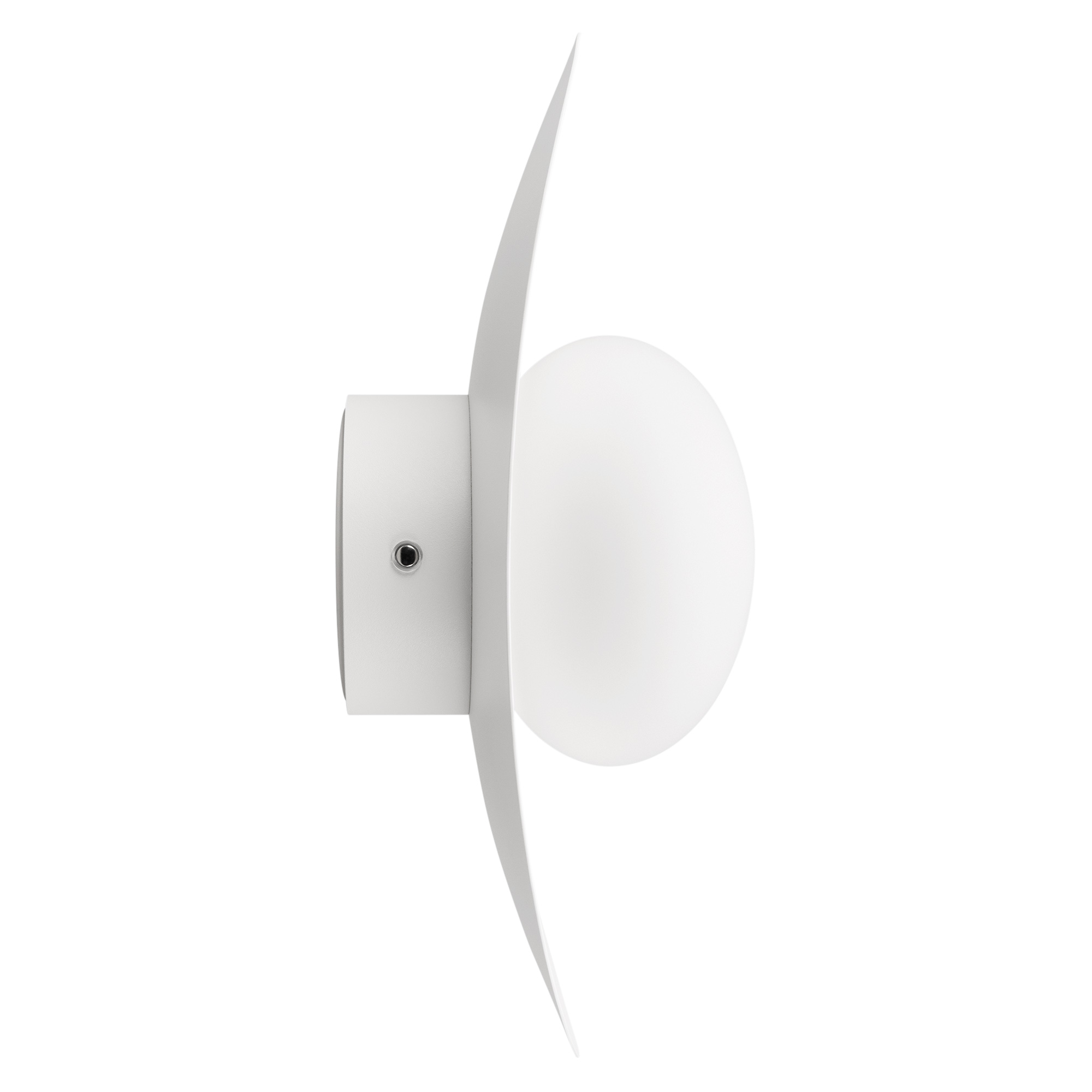 Декоративный настенный светильник. Мощность 6 Вт, св. поток 325-340 лм, 50-52 лм/Вт, теплый 2700 K,теплый 3200К, дневной 4000 K (переключаются) CRI>92, угол 150°, напряжение питания 230 В. Фигурный корпус из алюминия белого цвета, экран из матового стекла, степень защиты IP20. Размер: габариты световой части: Ø145x70 мм, габариты чаши: Ø110 x 42 мм. Монтаж накладной. Встроенный блок питания: 12В DC, 0,75 А, пульсация <2%. Встроенный диммер TOUCH-DIM.